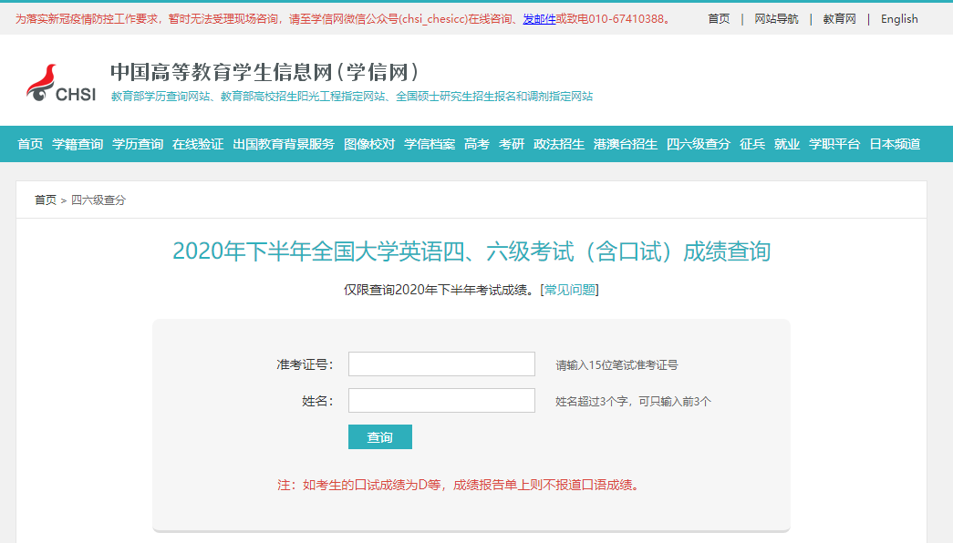 2020下半年全国大学英语四、六级考试成绩发布通知