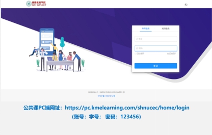 同时,公共课也可在电脑上学习,详见文末[公共课]平台使用说明”。网址:https://pc.kmelearning.com/shnucec/home/login