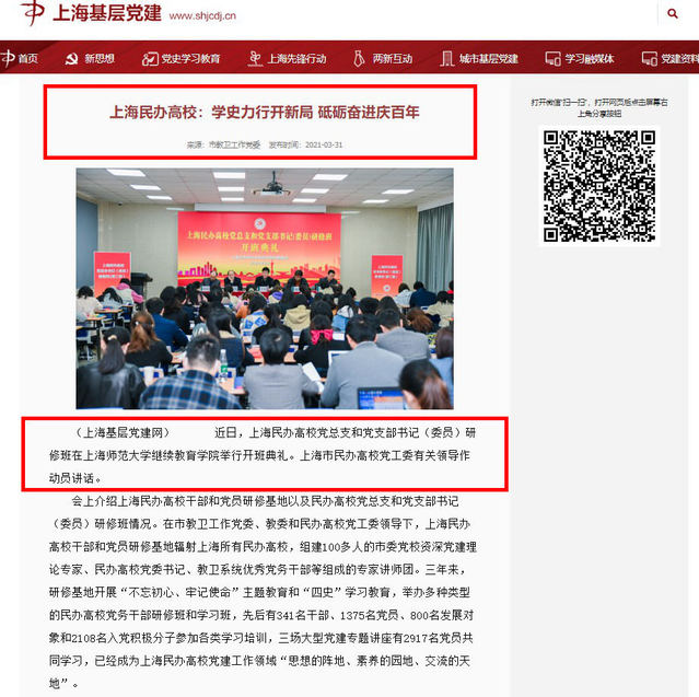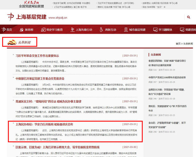 3月31日,上海基层党建网以“头条新闻”形式,专题报道我院为上海民办高校举办第三期党总支和党支部书记(委员)研修班,开展党史学习教育。