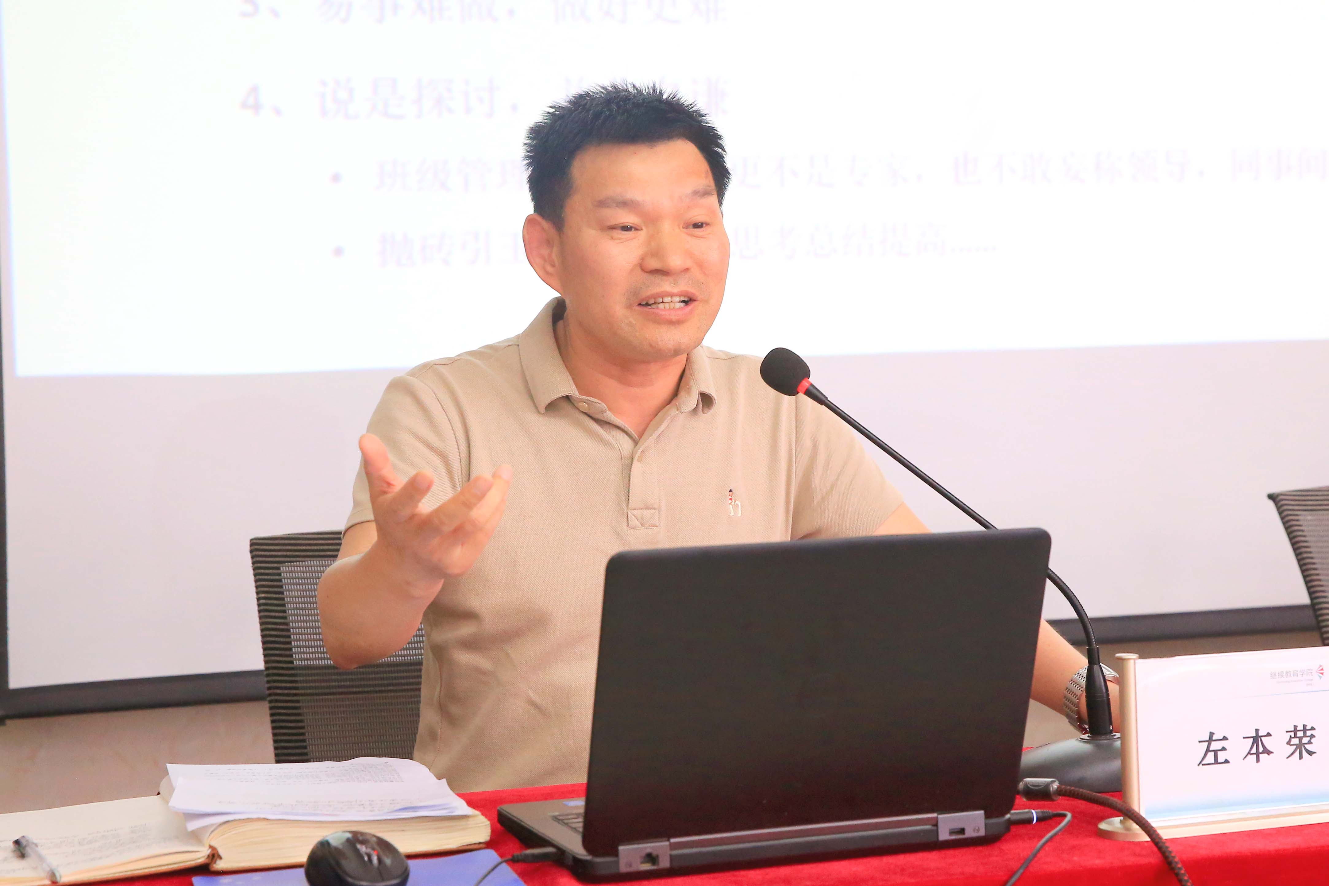 左本荣结合自己的教学经历和管理实践,尤其是学习站点管理和班级管理等经验,以“新时代怎样做好成教班主任”为主题,与各位教务员和班主任作深入交流。他先从班级管理的破题和解题入手,详细分析成人高等教育学生的特点,及其与全日制学生的差异,分析新时代成教班主任角色的定位;他梳理了成教班级管理中的常见问题,提出成教班主任在工作中要经常梳理问题,并善于区分问题的轻重缓急,研判问题的重要紧急程度,设法去破题解题,变问题为课题;他从三个方面提出班级管理基本策略,强调要以“立德树人”为根本任务,以“成事育人”为核心取向,以“培育自觉”为教育基础;基于成教学生的素质本底,提出成教班主任应该具有特殊的高素质,并提出提高素质的策略和路径。最后他通过“以法治班和以德治班”“上班状态和休息状态”“同理心和同情心”“做工作和干事业”“心理疏导和自我调适”等班级管理者通常遇到的几组关系,阐述了自己的管班治班理念,激发老师们从班主任的平凡重复事务中超脱出来,努力发现工作的价值和意义。