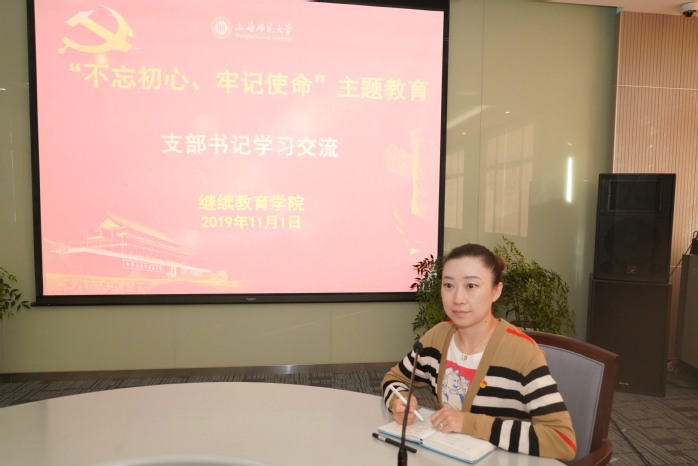 第二党支部书记尤佳同志以守初心,担使命,支部建设新作为为题,结合学习教育、调查研究、问题检视和落实整改各个环节的工作推进,作学习交流。她认为,守初心担使命,通过支部建设坚定党员的理想信念,要以支部建设引领思政教育,要找差距抓落实促进支部建设。支部建设中其中最重要的一项功能就是教育党员,充分发挥支部的战斗堡垒作用,以支部为单位,时刻教育党员引导党员,发挥对党员的先锋模范作用。只有思想上的统一才能落实到行动上的统一,推动学历教育的发展,助力学校高水平大学建设。思想政治教育工作是成人高等教育工作的一个切入点,不仅要外化于行,多措并举加强学生的思想建设、课程建设、文化建设等。按照主题教育的要求安排,全体党员通过对照党章党规检视问题找差距,作为支部书记,同样也存在思想认识、担当作为等方面的问题,并提出相应整改方案,通过即知即改,有效落实,进一步推进工作的开展和改进。